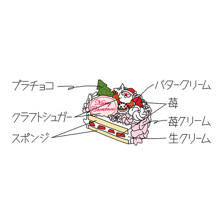 ふわふわのスポンジは、創業当初からのこだわり。2種の生クリームをブレンドして、甘さを抑え、食べやすく仕上げました。愛らしいデコレーションがクリスマスを彩ります。