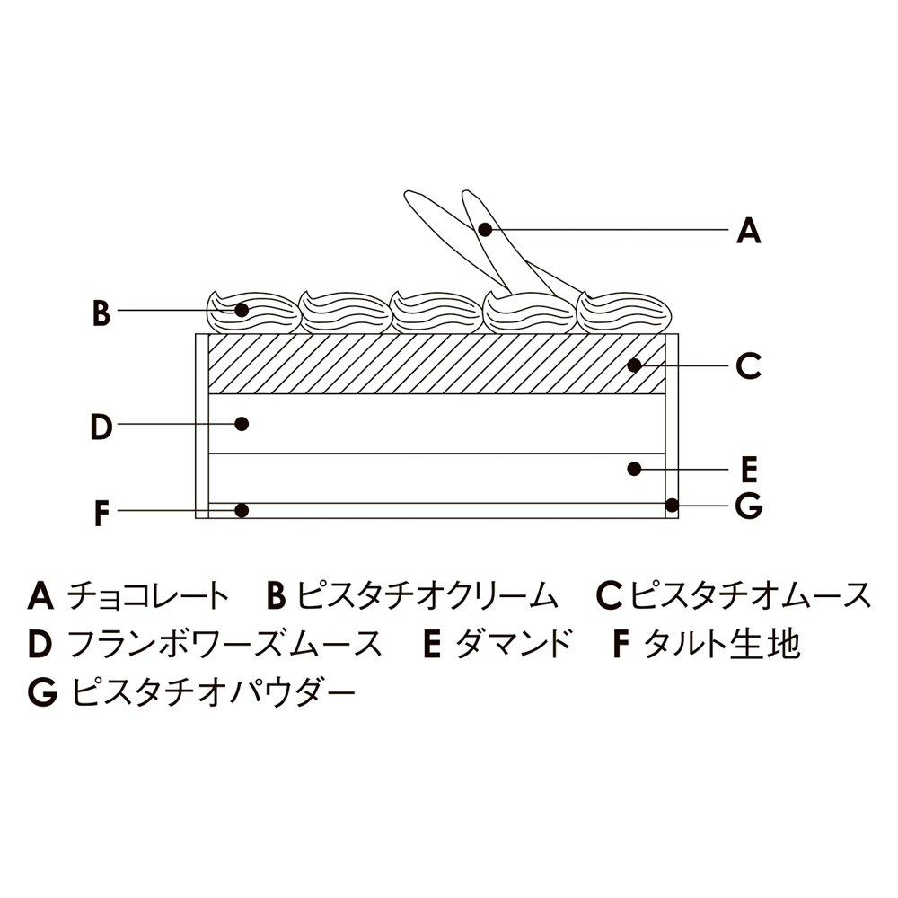 香ばしく焼きあげたタルトの土台に、ふわっと軽めのピスタチオのムースとフランボワーズのムースを組み合わせました。