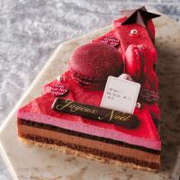 口どけなめらかなショコラクリームとフランボワーズのフルーティーな酸味を閉じ込めた、見た目も味わいも、クリスマスらしいケーキ。サクッとしたフィヨンティーヌの食感に、プラリネのコク深い層とムースの柔らかさとのコントラストが楽しい聖夜限定の一品です。