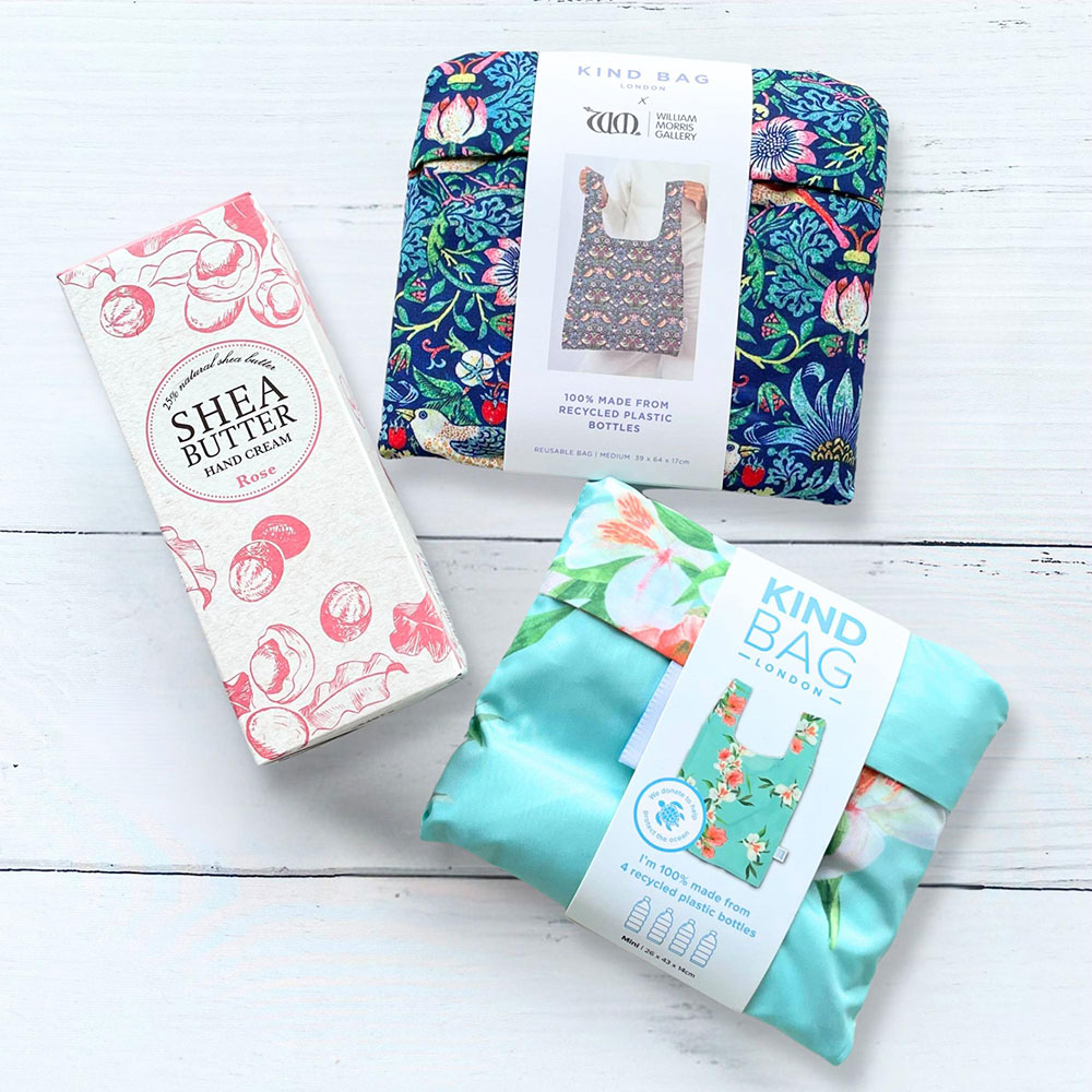 エコバッグ:使いやすくて丈夫で、使わない時は折りたたんでコンパクトに収納することができます。ミニサイズのフローラル柄とウィリアム・モリスのいちご泥棒柄の2種類セット。ハンドクリーム(ローズ):ハンドクリームはシアバター(保湿成分)配合。ローズエッセンシャルオイルを使用しております。