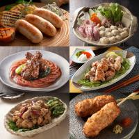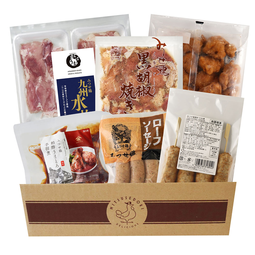 みつせ鶏九州水炊き710g(もも肉スライス200g×2、肉だんご230g、スープ80g)、みつせ鶏焼きつくね串220g(4本入り)、みつせ鶏やみつき山賊焼き400g、みつせ鶏粕酢うまとろ手羽煮160g、みつせ鶏ローフソーセージ180g(3本入り)、みつせ鶏黒胡椒焼き180g