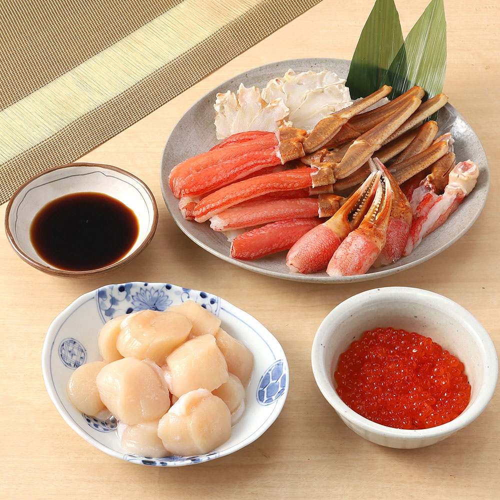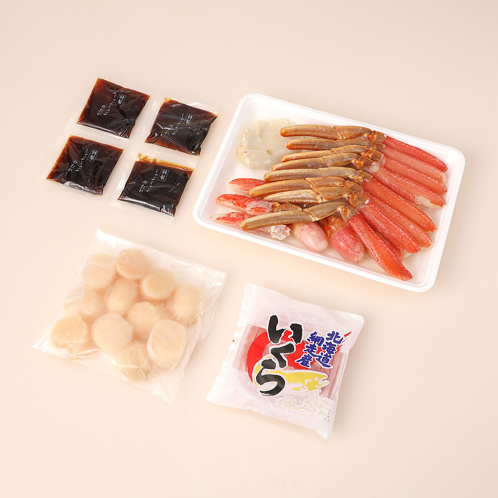 生ズワイガニポーション2種(棒&肩・爪)600g、カニしゃぶのタレ28g×4、北海道産いくら醤油漬100g、北海道産ホタテ貝柱250g
