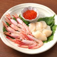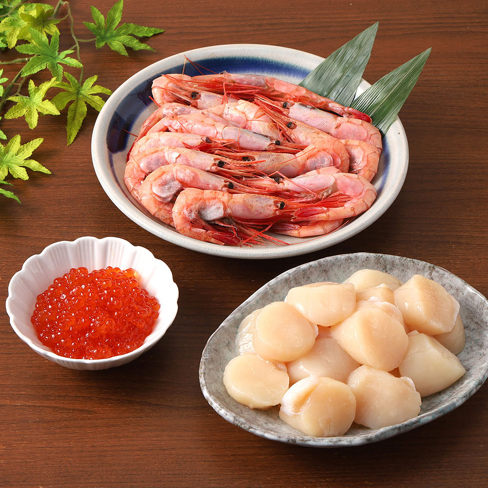 北海道産いくら醤油漬100g、北海道産ホタテ貝柱400g、ロシア産甘えび400g