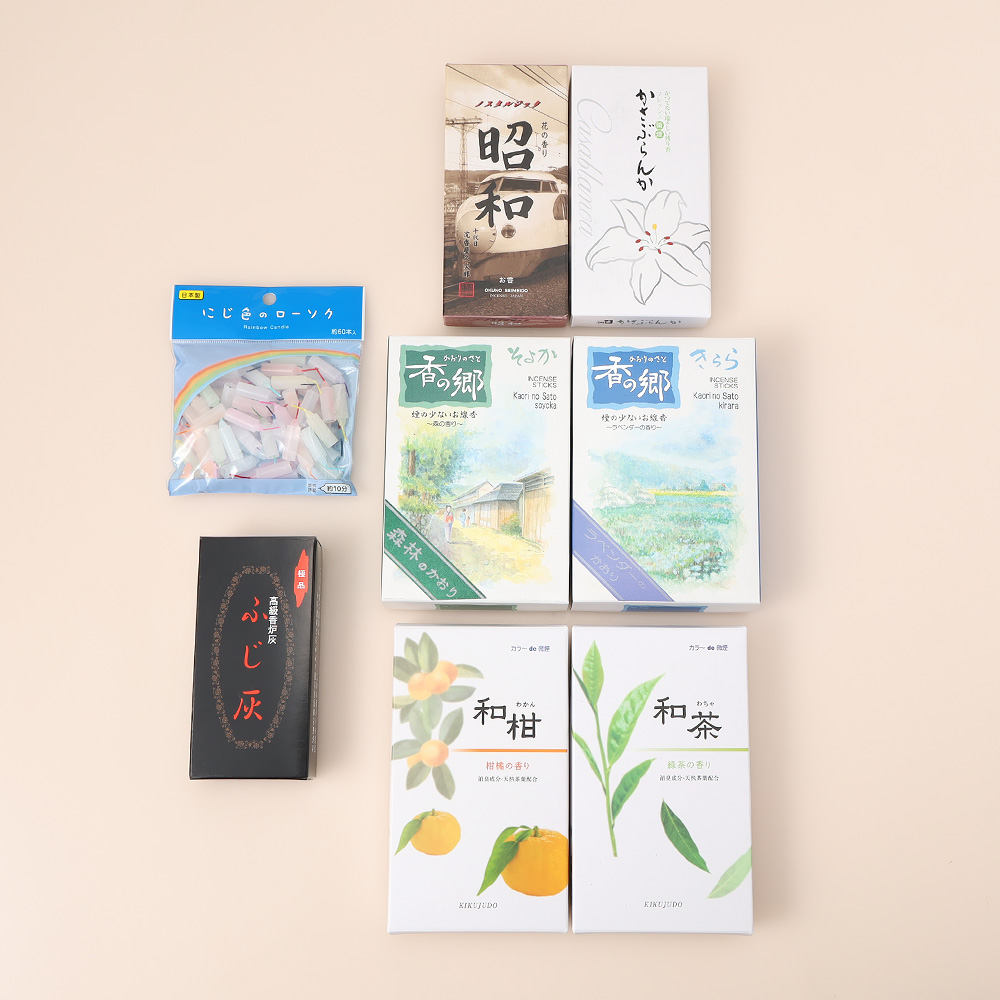<セット内容>香の郷きらら(ラベンダー)大バラ、香の郷そよか(森林の香り)大バラ、かさぶらんかバラ詰、昭和・新幹線(花の香り)中バラ、和柑(柑橘の香り)中バラ、和茶(緑茶の香り)中バラ、にじいろローソク、ふじ灰 箱入25g 計8点