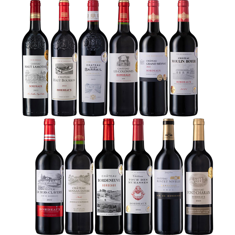 シャトー・モンサン・エステーヴ 2018(赤/フランス/フルボディ)、シャトー・グラン・メイノ2021(赤/フランス/フルボディ)、シャトー・ポンテ・ニヴェル2021(赤/フランス/ミディアムボディ)、シャトー・トゥール・デ・ミュラス2021(赤/フランス/フルボディ)、シャトー・ムーラン・ボイエ2021(赤/フランス/ミディアムボディ)、シャトー・ギヨン・バライ 2022(赤/フランス/フルボディ)、シャトー・デュボワ・クラヴリ2022(赤/フランス/フルボディ)、シャトー・ボルドヌーヴ2022(赤/フランス/フルボディ)、シャトー・オー・ラモット 2022(赤/フランス/ミディアムボディ)、シャトー・レ・コロンヌ 2022(赤/フランス/ミディアムボディ)、シャトー・オー・ブルボン 2022(赤/フランス/フルボディ)、シャトー・ポンシャラック2023(赤/フランス/フルボディ) 各750ml 計赤12本