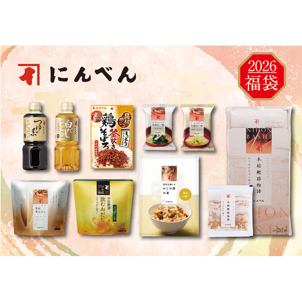 本枯鰹節物語2g×20袋、素材薫るだし かつお10g×5袋、つゆの素ゴールド500ml、白だしゴールド500ml、ふわっと玉子のお吸い物1食、わかめのおみそ汁1食、かしわ飯の素2合用、鶏そぼろふりかけ30g、本枯鰹節 飲むおだしかつおと昆布6g×5袋