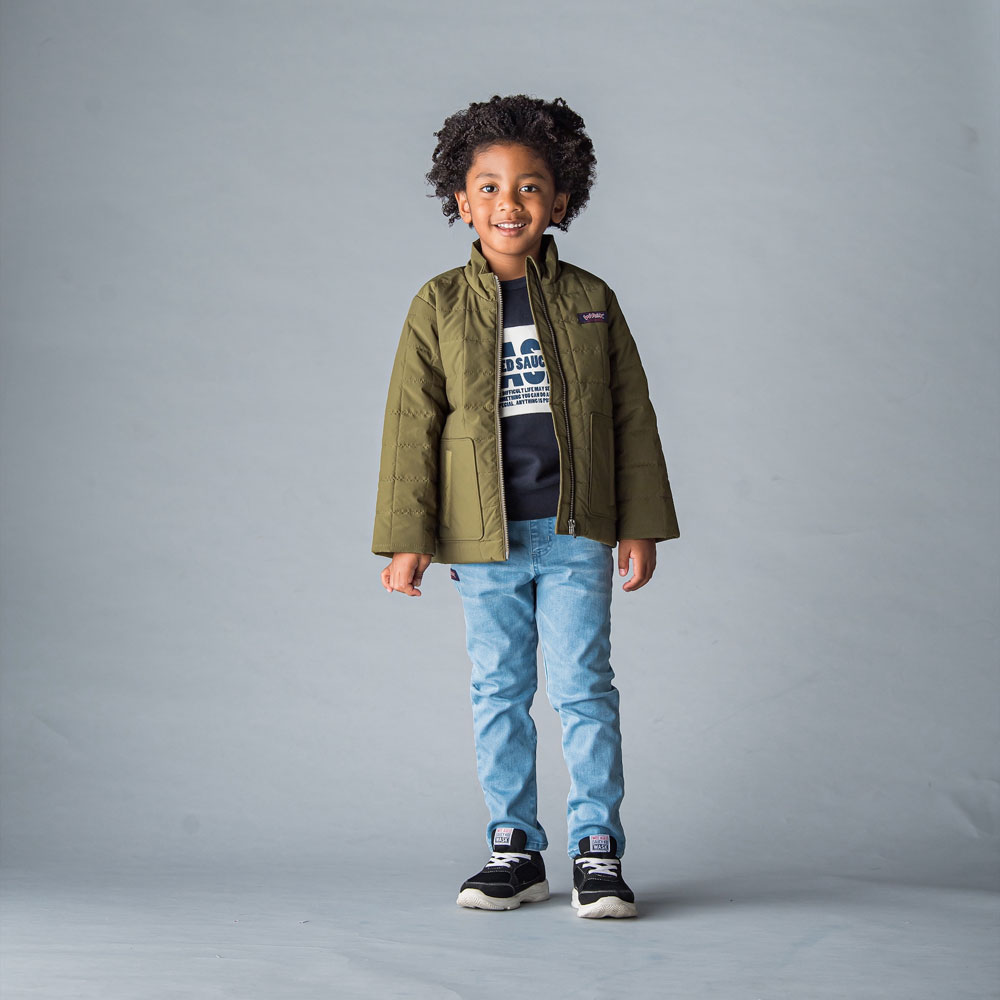 <セット内容>中わたジャケット×1、ロゴプリントトレーナー×1、ボーダーTシャツ×1、ストレッチデニムパンツ×1 計4点(ロゴ入りバッグ付)