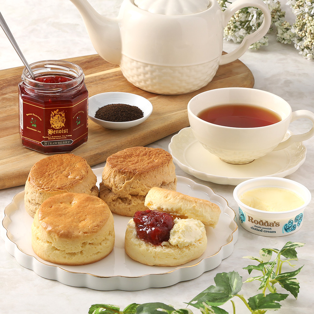 スコーン(プレーン)2個入×1、スコーン(紅茶)2個入×1、ストロベリージャム200g×1、クロテッドクリーム40g×1、セイロンウバ60g袋入×1、ベノアオリジナルエコバック×1