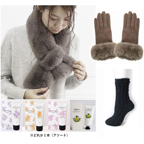 首元を華やかに見せるファーのティペット・手袋・もこもこソックス・ハンドクリームが入った、お買い得な婦人雑貨福袋です。