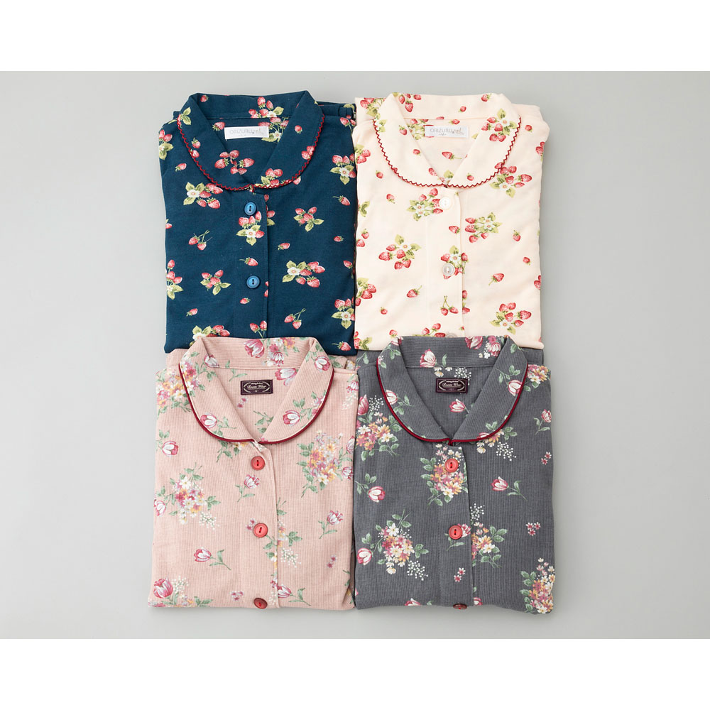 丸みのある襟と、シックなカラーのプリントが優しいイメージのパジャマ2点セットです