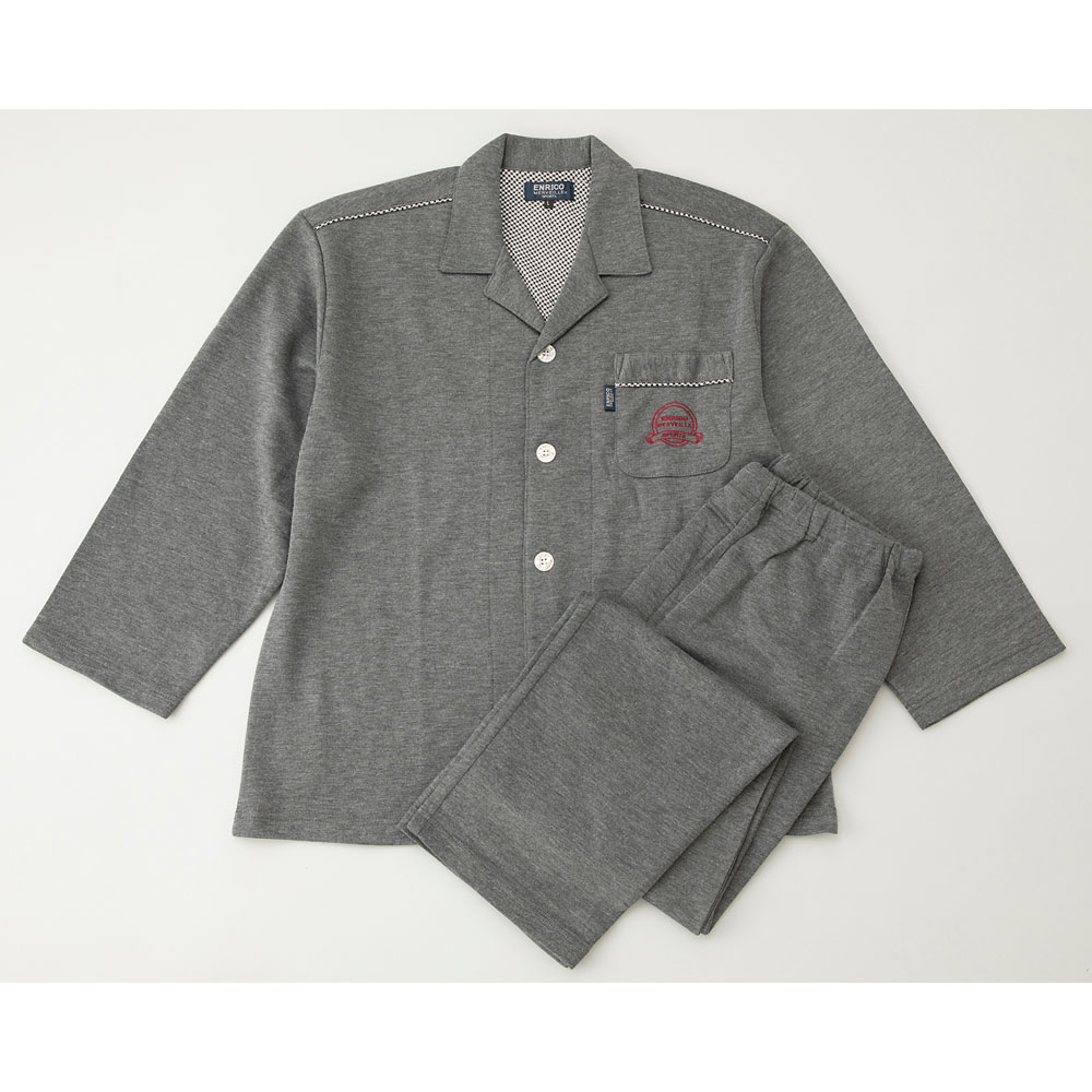 あったか素材のテーラーパジャマ。無地とボーダーを1点ずつをお届けします。前ボタンで全開できるのと、裏面が綿100%なのもポイントです。