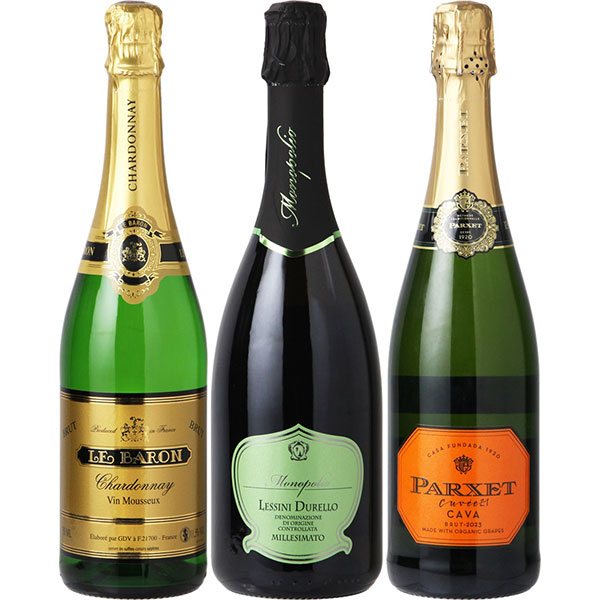 ヴァン・ムスー・シャルドネ・ブリュット・ル・バロン NV/GDV(フランス)、レッシーニ・ドゥレッロ・DOC・スプマンテ・ブリュット・ミレッジマート 2023/カンティーナ・ディ・ガンベッラーラ(イタリア)、カバ・ブルット・キュベ21 2023/パルシェット(スペイン)すべて白・泡/辛口 各750ml 計3本