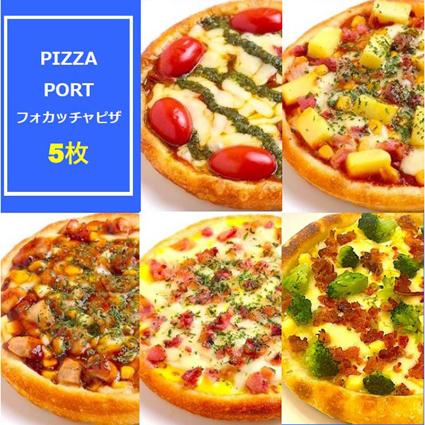 フォカッチャピザ(直径約17cm):トマトが美味しいマルゲリータ×1、ジャーマンポテト×1、照り焼きチキン×1、モチッとカルボナーラ×1、ブロッコリーとベーコンのピザ×1 計5点