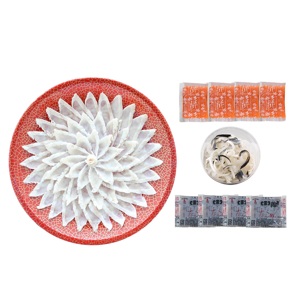 真ふぐ霜降り刺身(25cm皿)100g、とらふぐ皮60g、ふくポン酢10g×4、もみじおろし10g×4