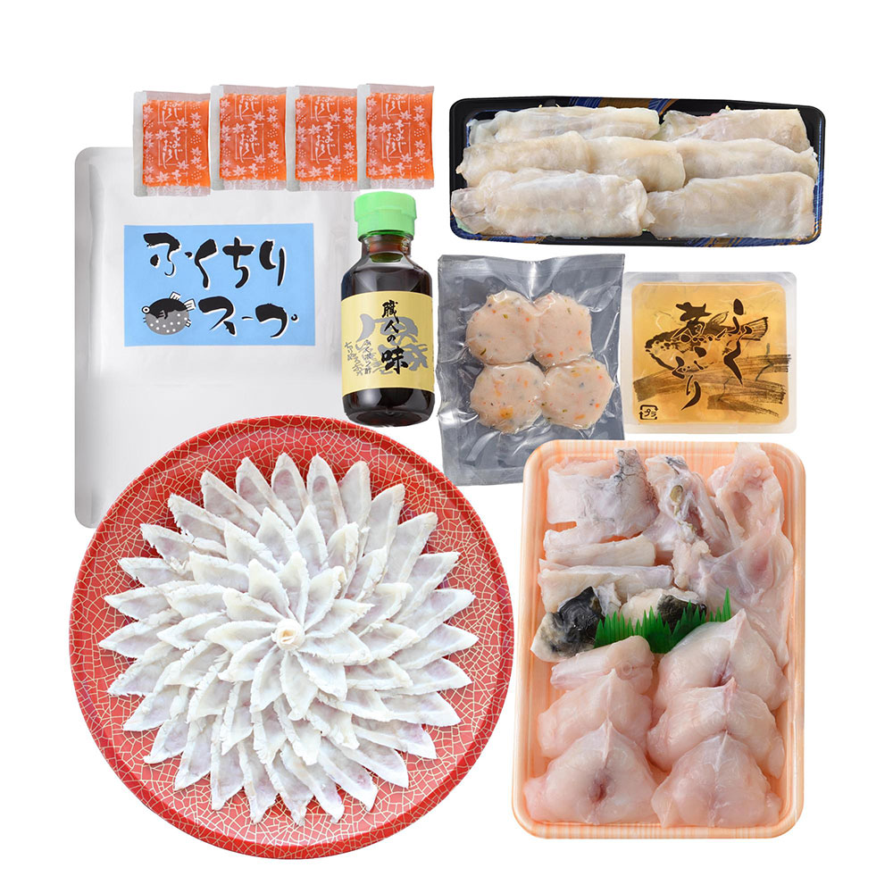 真ふぐ霜降り刺身(25cm皿)100g、ふぐちり(シロサバフグ切身、トラフグアラ)360g、とらふぐすき身(身皮)75g、ふぐ煮こごり100g、ふぐつみれ40g、ふぐちりスープ300g、ふくポン酢100ml、もみじおろし10g×4