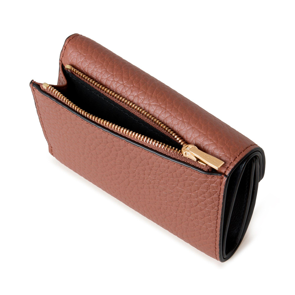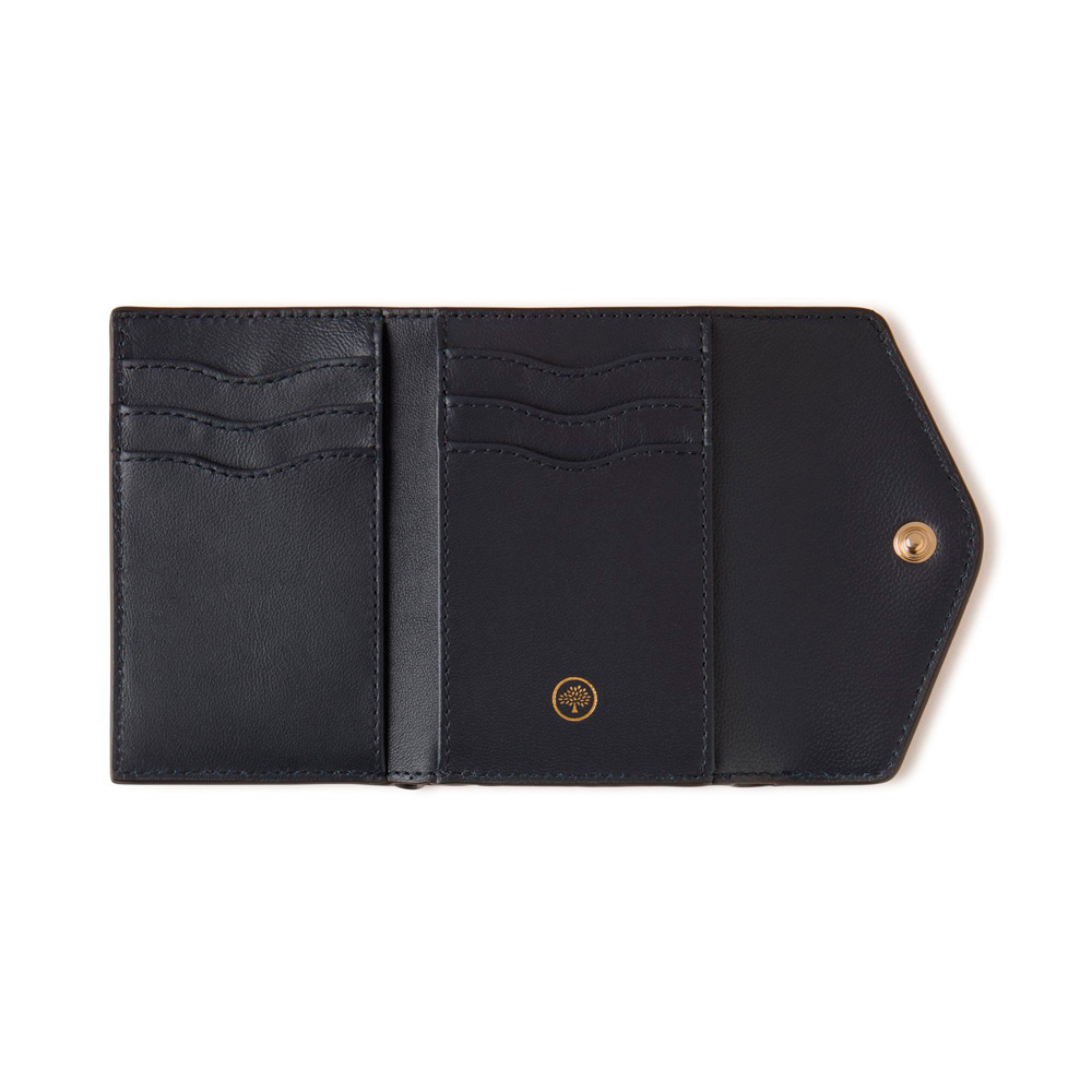 マルベリーロゴが刻印されたスナップボタン付きの折りたたみ式カードウォレット。コンパクトかつ実用的なデザインで、バッグやポケットに入れて持ち運ぶのに便利です。