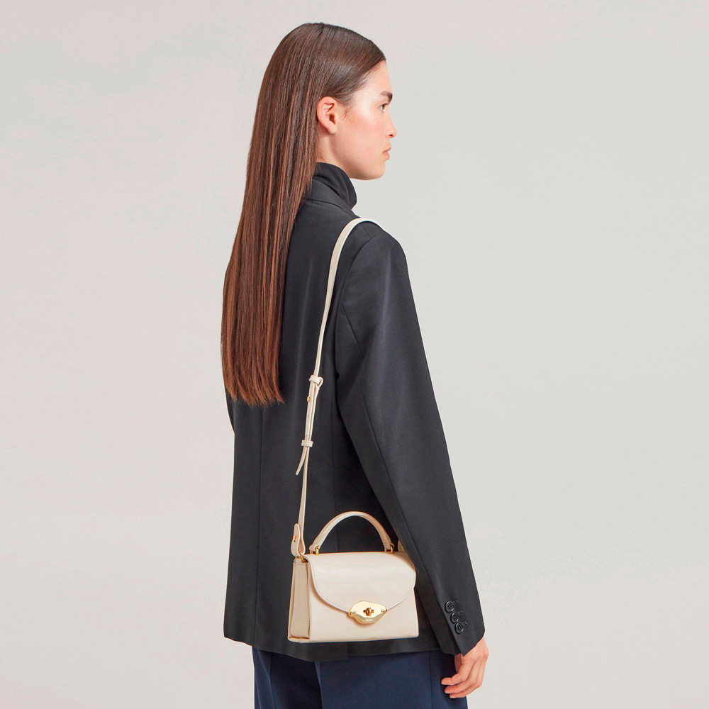 デイタイムからイブニングシーンまで、活躍の場を選ばないラナ トップハンドル(スモール)。なめらかな線を描くシルエットと、かっちりとした上向きのハンドルを特徴とするエレガントなデザインが魅力です。アイコニックなポストマンズロックを、ダリの作品を思わせるモダンなスタイルにアレンジした、存在感を放つ新作の留め具「ファウンドリーロック」が採用されています。