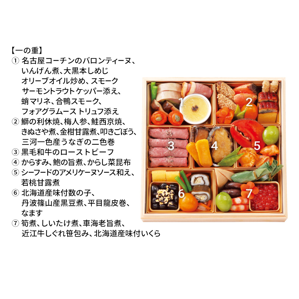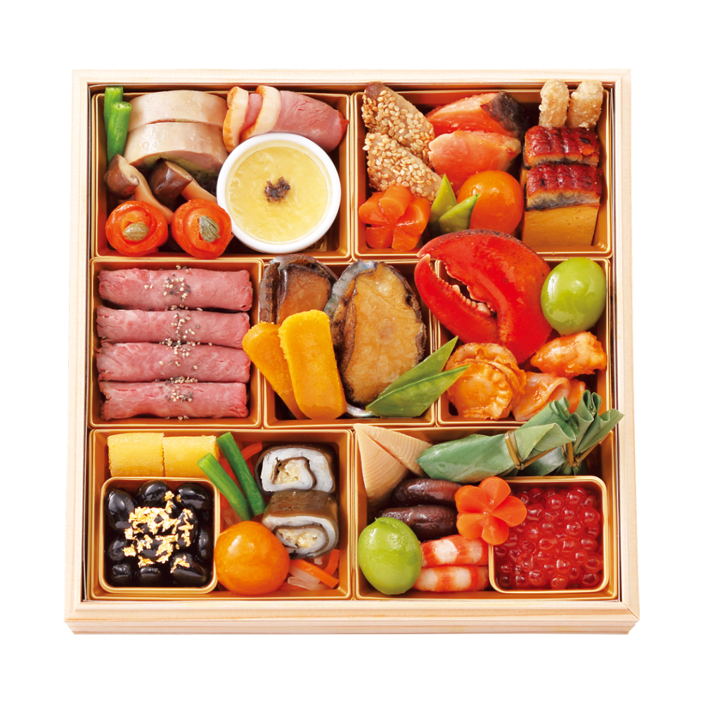 うなぎの二色巻や近江牛しぐれ笹包みなどの和風料理と、フォアグラなど洋風料理を豪華に。