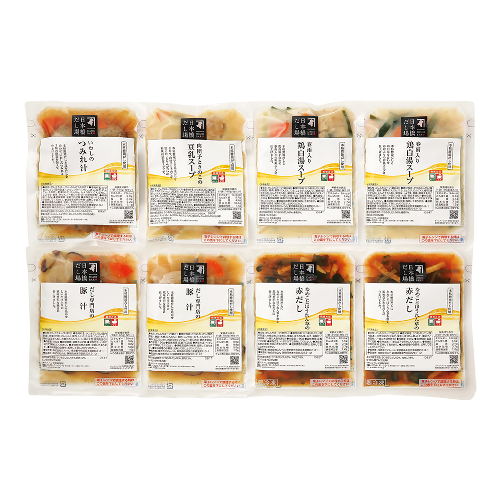 だし専門店の豚汁・なめことほうれん草の赤だし・春雨入り鶏白湯スープ 各190g×2、いわしのつみれ汁・肉団子ときのこの豆乳スープ各190g 計8食※電子レンジ対応