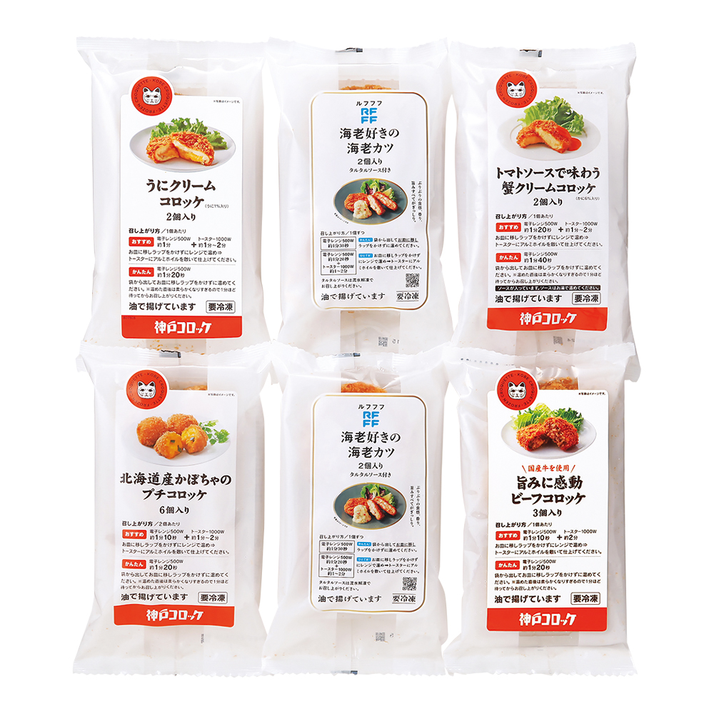 海老好きの海老カツ2個入り タルタルソース付×2、うにクリームコロッケ2個入り、トマトソースで味わう 蟹クリームコロッケ2個入り、旨みに感動 ビーフコロッケ3個入り、北海道産かぼちゃのプチコロッケ6個入り ※電子レンジ対応