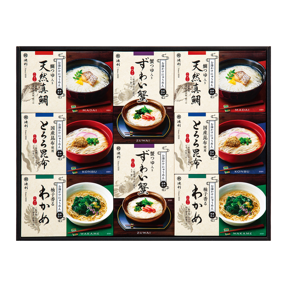 にゅうめん(蟹つゆ入りずわい蟹・鯛つゆ入り天然真鯛・とろろ昆布・柚子香るわかめ各2):麺各45g、つゆ・具材付