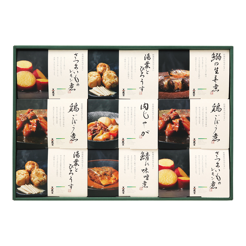 鶏ごぼう煮・さつまいものレモン煮各70g×2、鰯の生姜煮・鯖の味噌煮各70g、肉じゃが80g、湯葉とひろうす3個×2