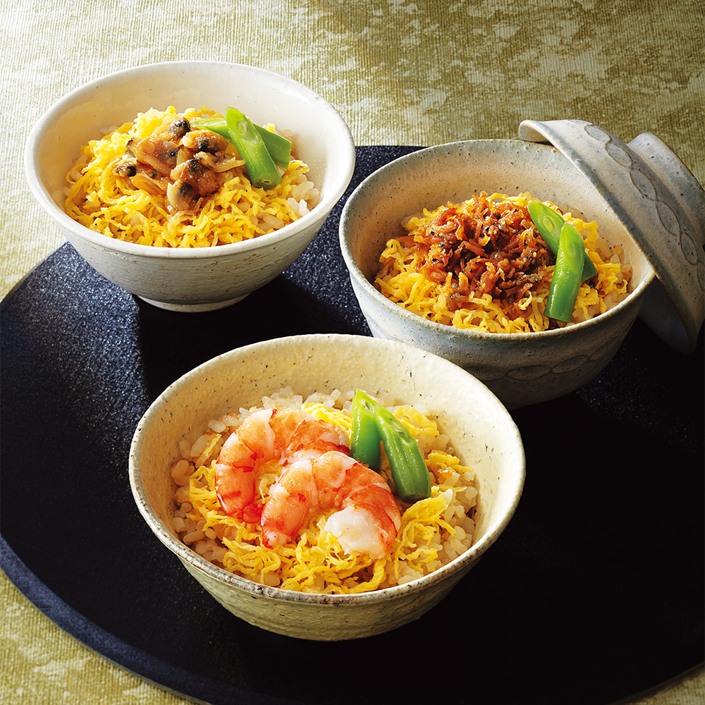 北海道産天然昆布で丁寧にとった一番だしで、風味豊かな炊き込みご飯に。海老、ちりめん、あさりの具材で彩りよく仕上げました。