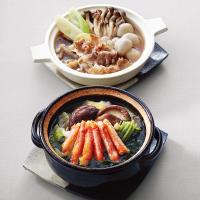 蟹鍋と、牛肉と里芋の鍋の2種。鍋で温めるだけで本格的な味わいをお楽しみいただけます。