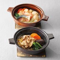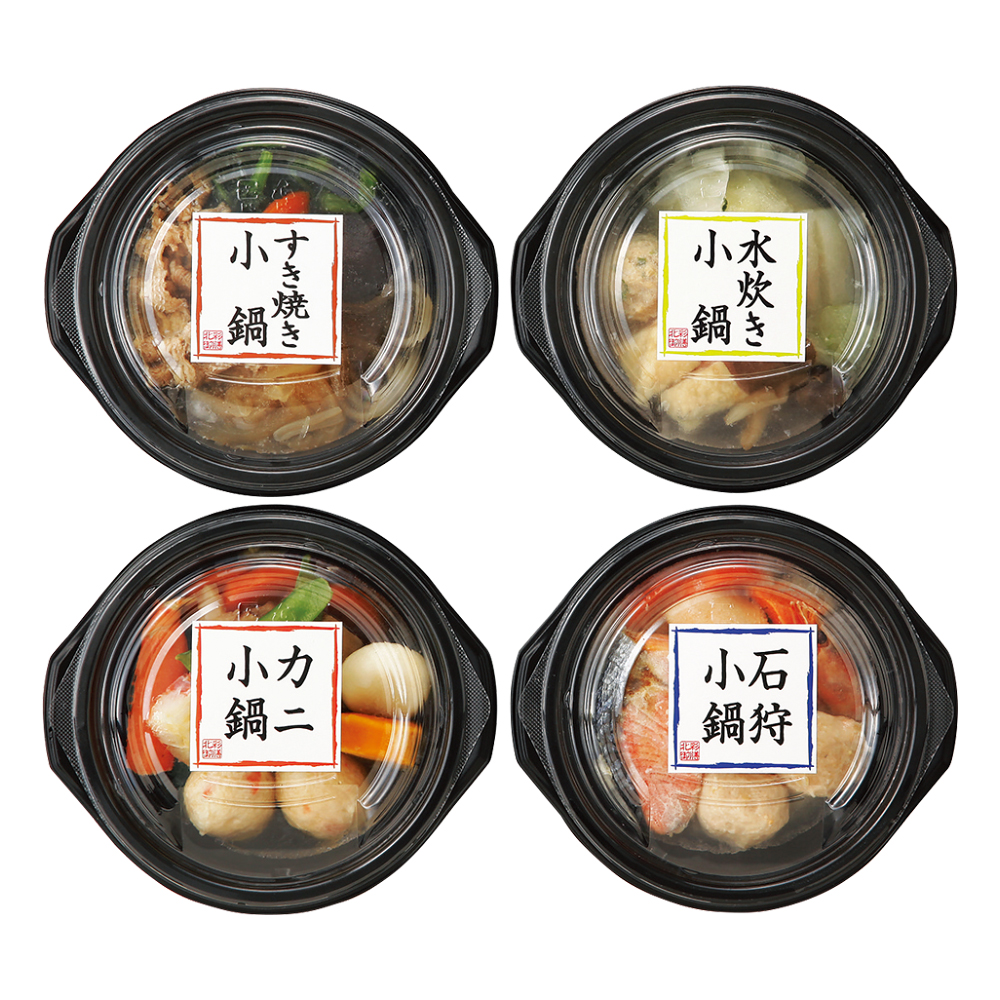 石狩鍋、カニ鍋、すき焼き、水炊きの鍋料理4種を、電子レンジで温めるだけの小分け鍋に。