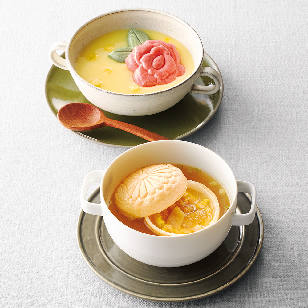 花をかたどった「花椀もなか」や「花一りん最中」。食卓を華やかに彩る和洋のスープやお吸物などのセットです。