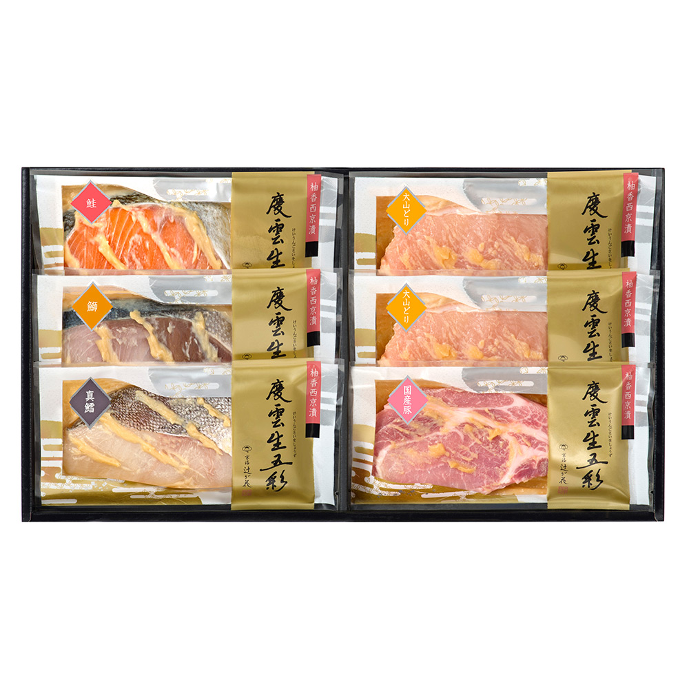西京味噌を独自調味し、素材を漬け込んだ西京漬。別添レンジシート使用でレンジ調理も可能。魚だけでなく、豚肉、鶏肉も入った、人気の魚と肉のセット。柚子の香りを忍ばせ、素材の旨みを引きだしました。