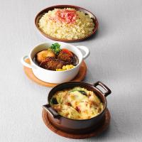 北海道産の牛肉・豚肉・紅ずわいがにを使用したビーフシチュー、ポークグラタン、紅ずわいがにのピラフの洋食3種。