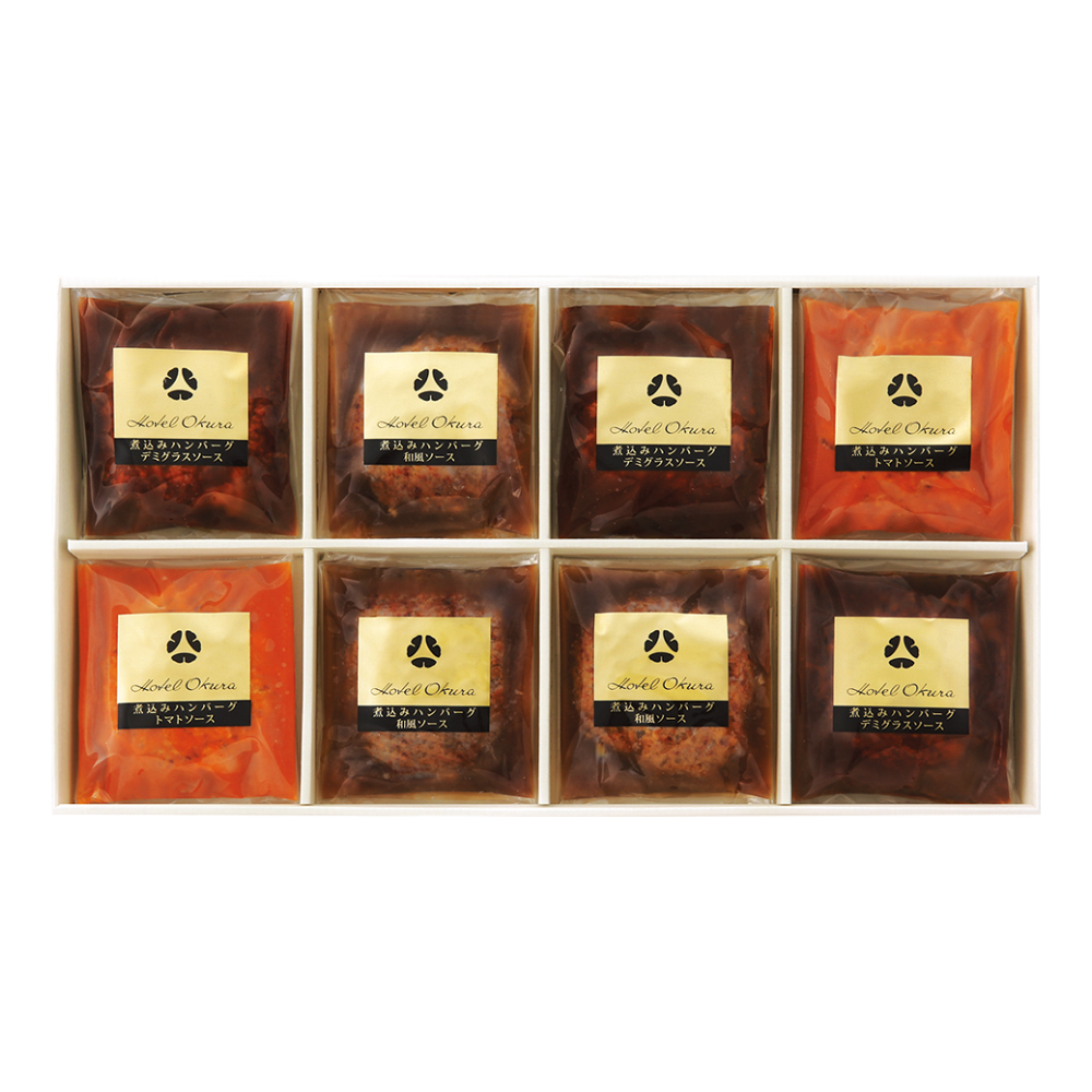 煮込みハンバーグデミグラスソース・煮込みハンバーグ和風ソース各110g×3、煮込みハンバーグトマトソース110g×2 お届け時期:12月28日まで(承り期間:12月22日まで)
