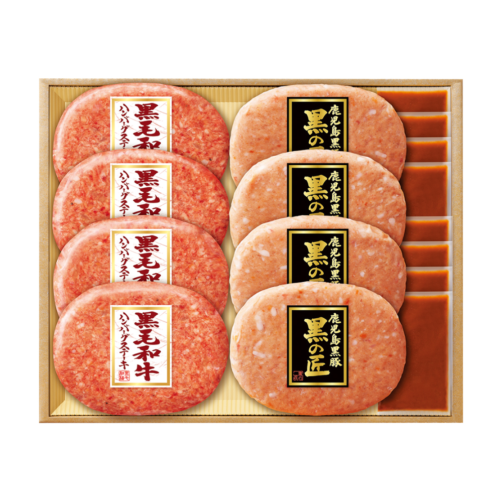 黒毛和牛ハンバーグ150g・黒豚ハンバーグ160g各4、ハンバーグソース20g×8
