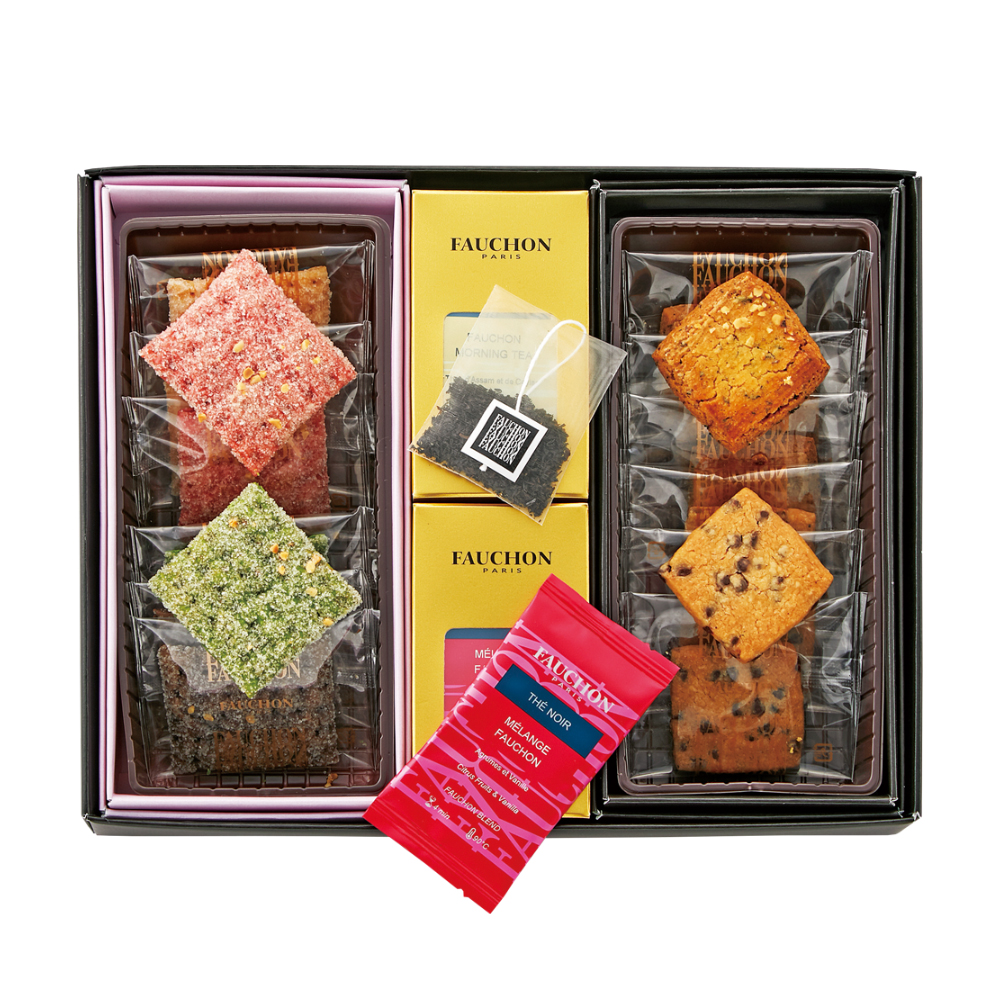ティーバッグ×8(フォションモーニング・フォションブレンド各4)、サクリスタン×8(ナチュール・フランボワーズ・ピスターシュ・ショコラ各2)、クッキー×8