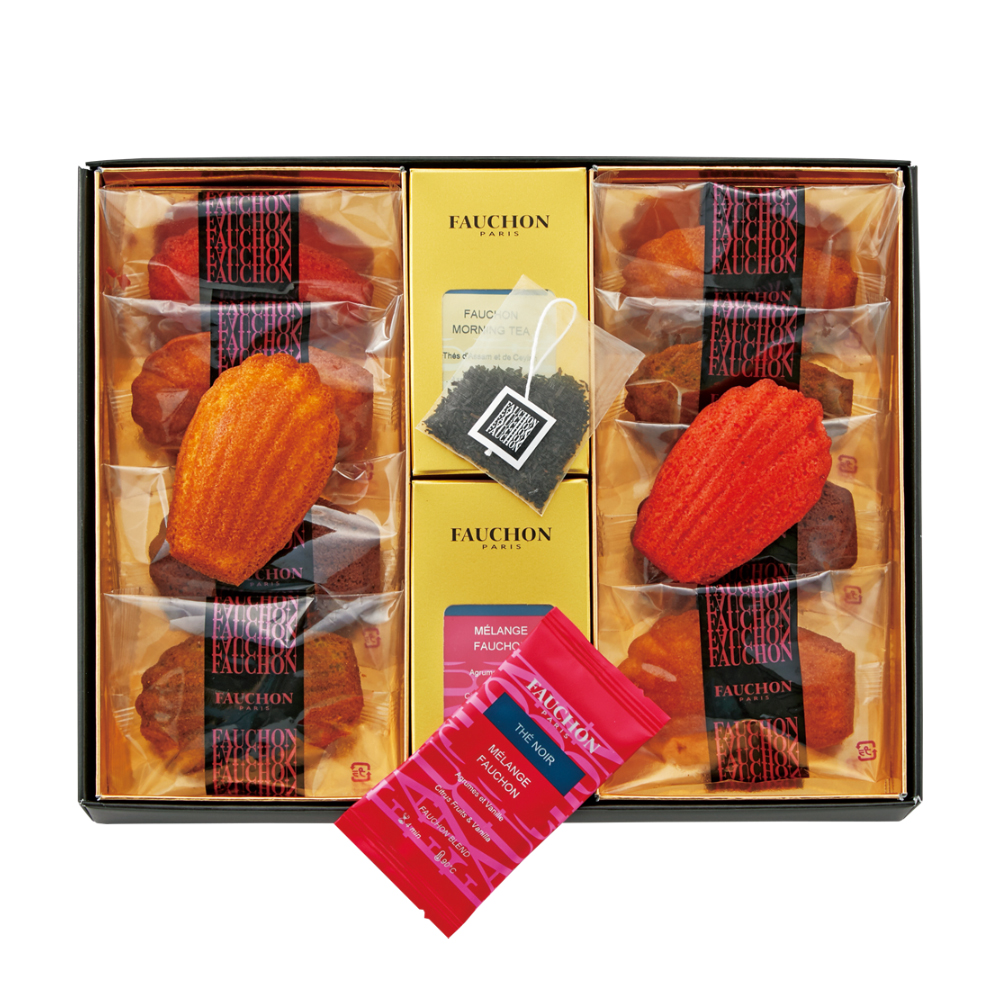 ティーバッグ×8(フォションモーニング・フォションブレンド各4)、マドレーヌ×10(ナチュール×4、フランボワーズ・ピスターシュ・ショコラ各2)