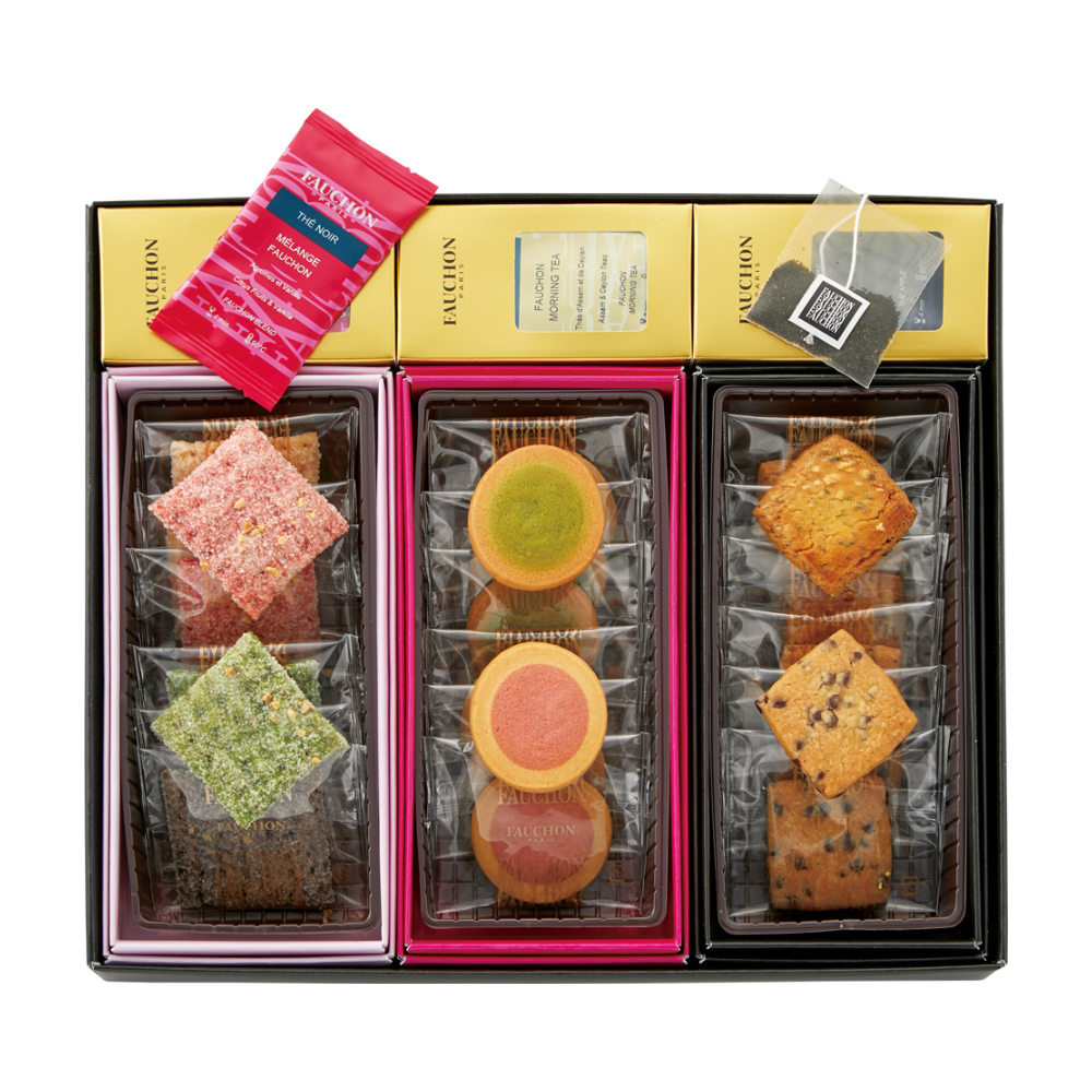 ティーバッグ×12(フォションモーニング・フォションブレンド・アップル各4)、サクリスタン×8(ナチュール・フランボワーズ・ピスターシュ・ショコラ各2)、クッキー×16