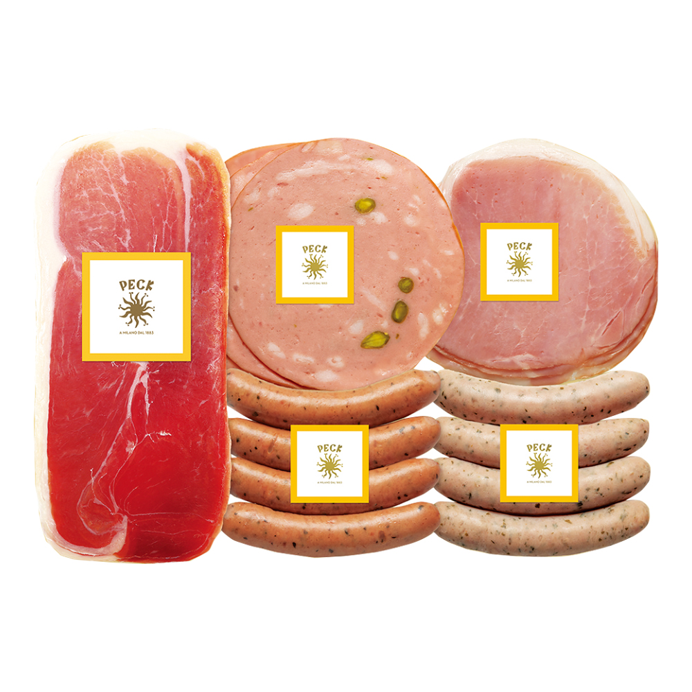 プロシュット(生ハム)30g、ロースハム51g、モルタデッラ54g、レモン&パセリウインナー・ハーブソーセージ各92g
