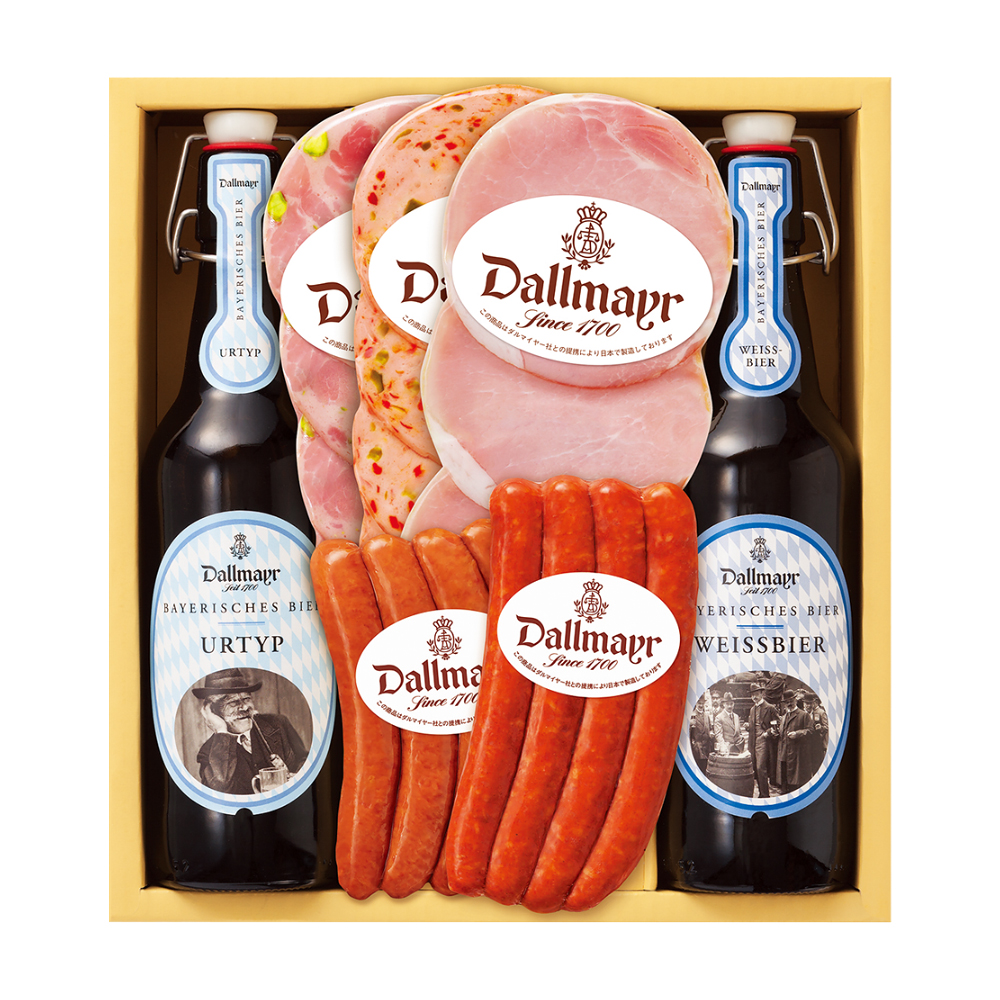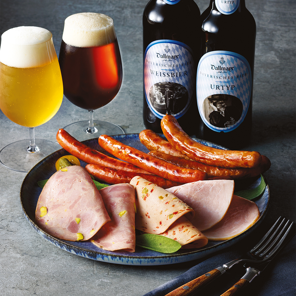 バイエルンビール(ウルチップ(黒)・ヴァイス(白))各500ml、カセラーロレ38g、カイザービアシンケン50g、パプリカリオナー55g、デブレツィナー・ケーゼクナッカー各160g