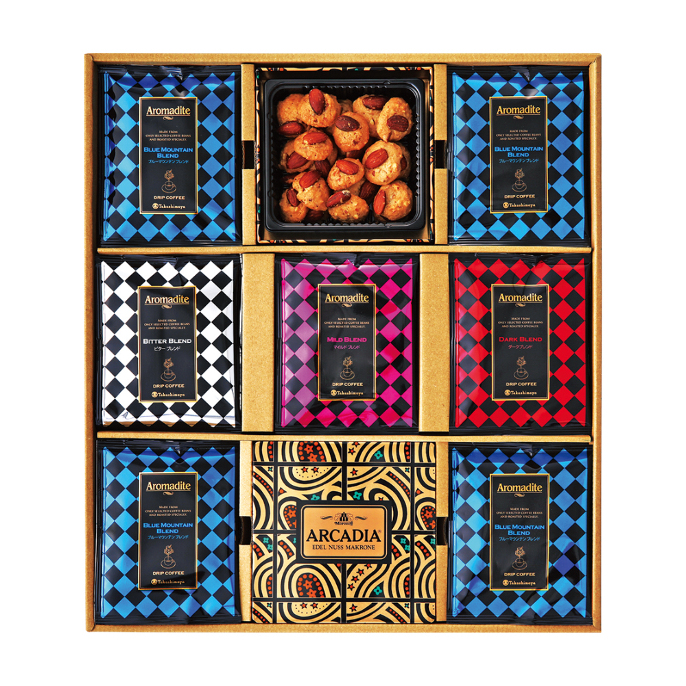 ドリップコーヒー(ブルーマウンテンブレンド12P、ビターブレンド・マイルドブレンド・ダークブレンド各3P)計21、モロゾフ アルカディア90g×2