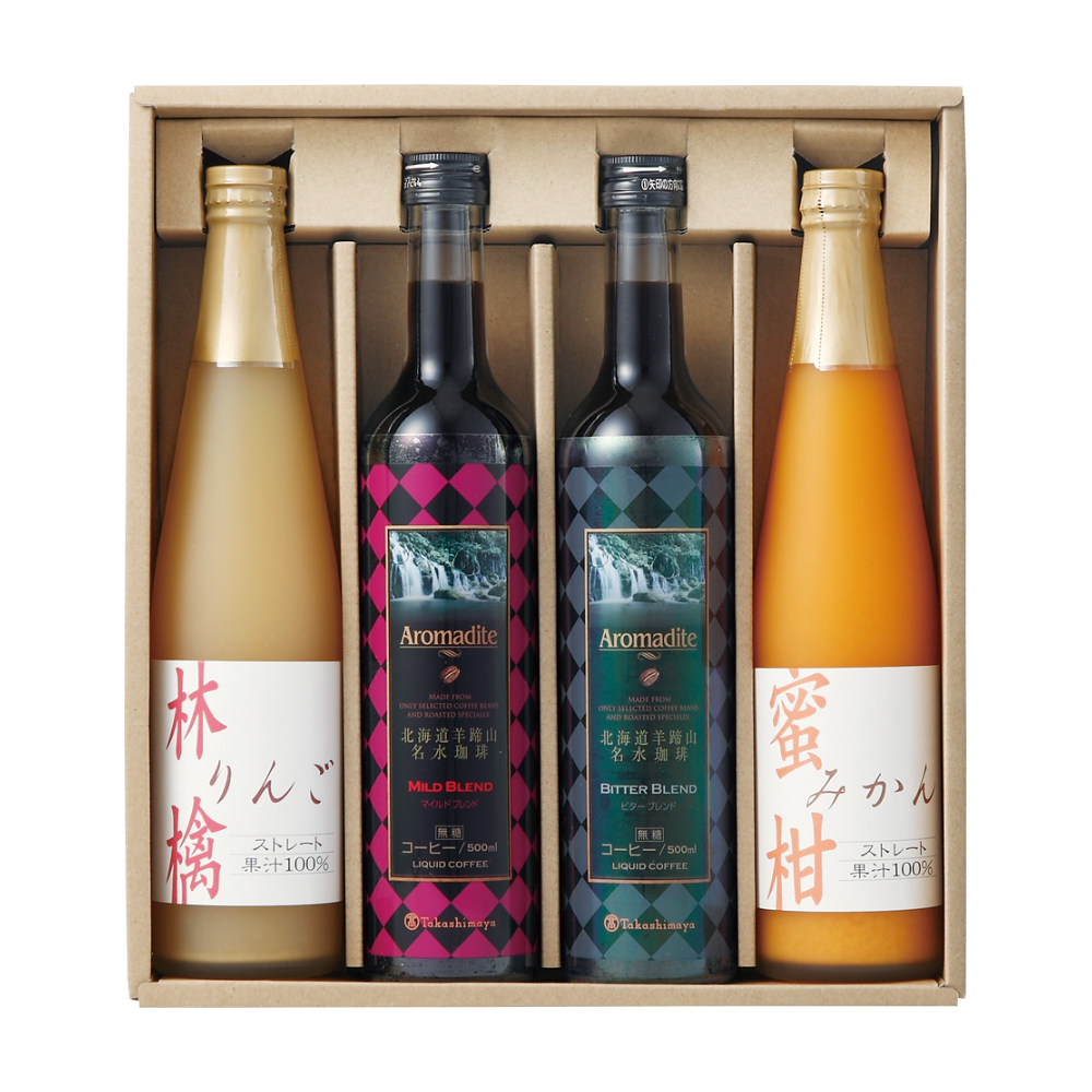 名水珈琲(マイルドブレンド・ビターブレンド)各500ml無糖、ストレートジュース(りんご・みかん)各500ml 原料原産地:りんご・みかん(国産)