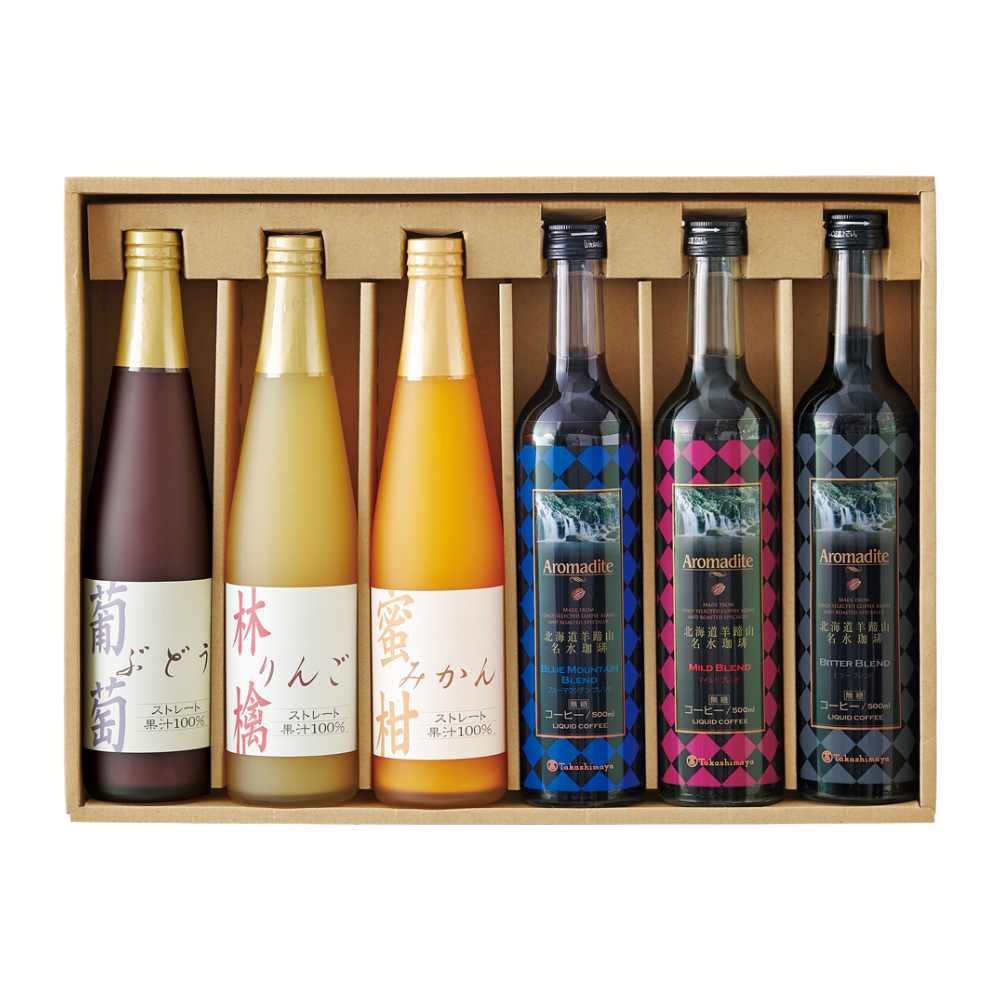 名水珈琲(ブルーマウンテンブレンド・マイルドブレンド・ビターブレンド)各500ml無糖、ストレートジュース(ぶどう・りんご・みかん)各500ml 原料原産地:ぶどう・りんご・みかん(国産)