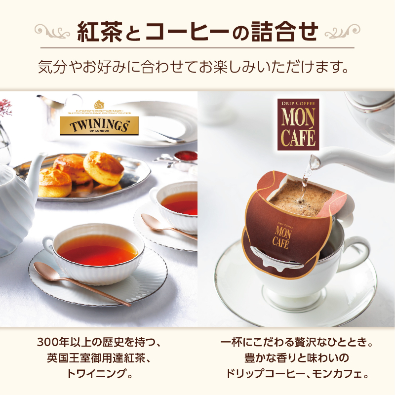 人気のブランド、モンカフェとトワイニングを取り揃えたバラエティギフトシリーズ。こだわりの味わいをいつでもどこでもシーンに合わせてお楽しみいただけます。