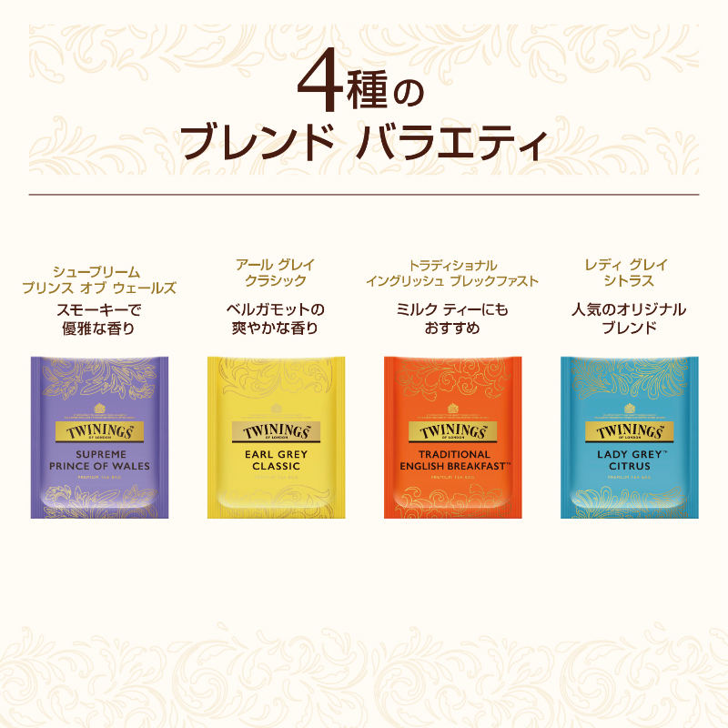 コーヒー(キリマンジャロ・モカ・コロンビア・コスタリカ)各3 計12、紅茶(アールグレイ・イングリッシュブレックファスト・プリンスオブウェールズ・レディグレイ)各6 計24