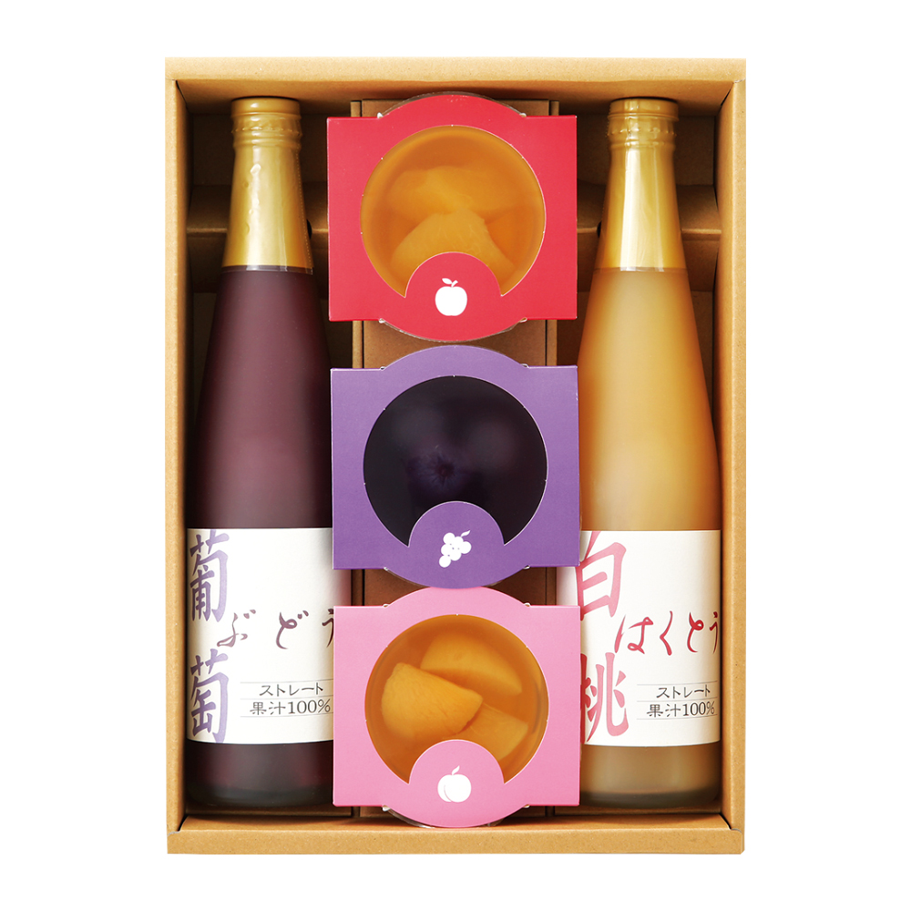 ジュース(ぶどう・白桃)各500ml、国産フルーツゼリー(りんご・ニューピオーネ・白桃)各190g
