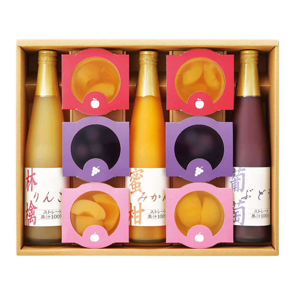 ジュース(りんご・みかん・ぶどう)各500ml、国産フルーツゼリー(りんご・ニューピオーネ・白桃)各190g×2
