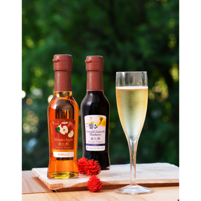 フレッシュ感あふれるみずみずしい香りの「信州りんごの酢」と柑橘とベリーの組み合わせを楽しめる程よい酸味の「瀬戸内レモンとブルーベリーの酢」の詰合せです。