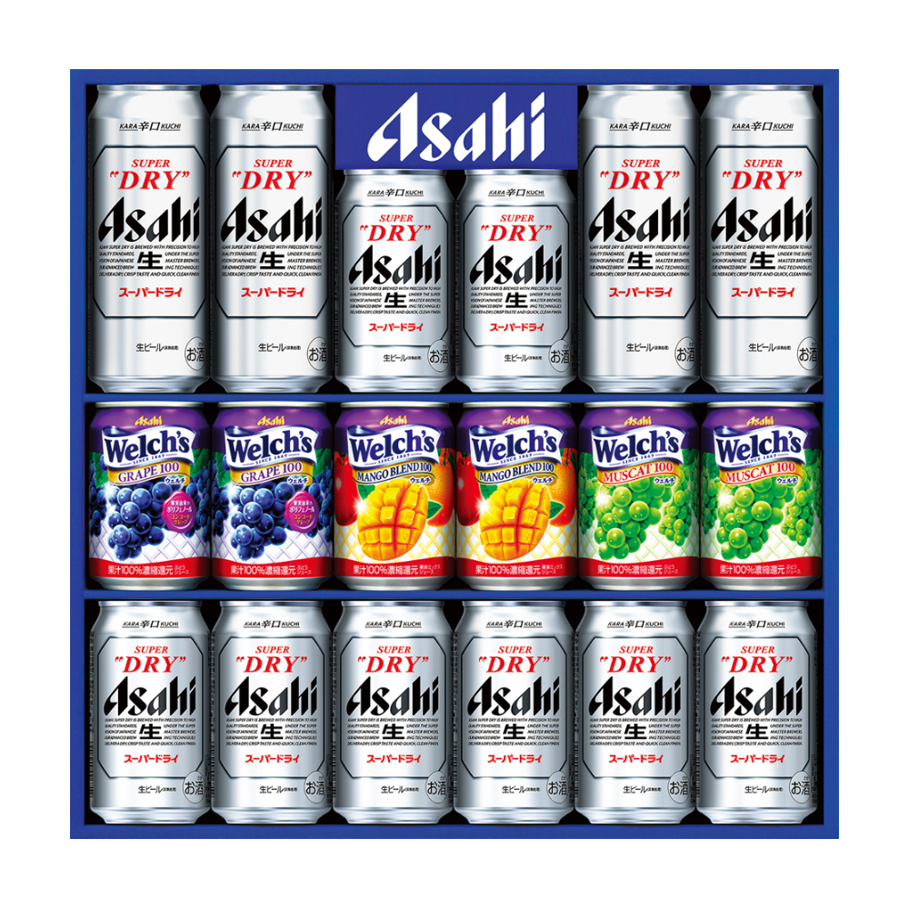 スーパードライ350ml×8・500ml×4、ウェルチ100(コンコードグレープ・マンゴーブレンド・マスカット)各280g×2