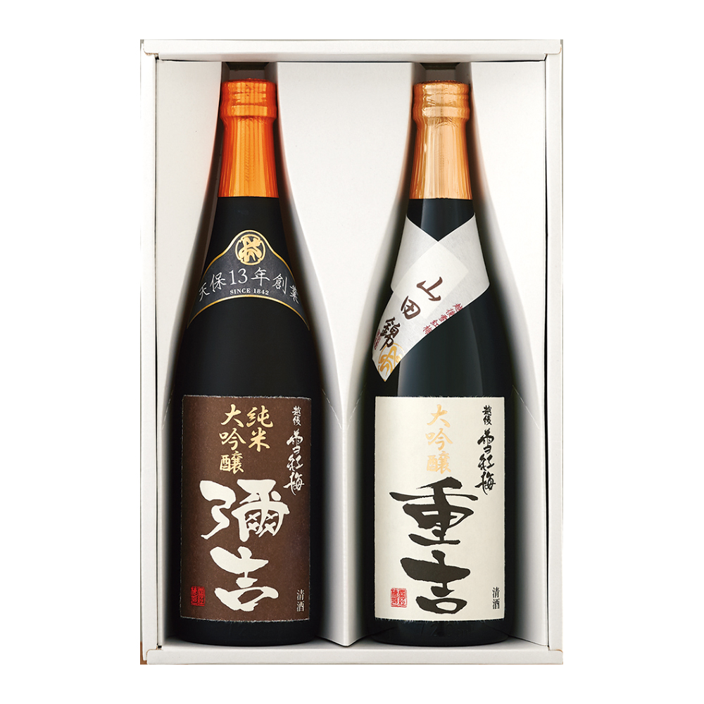天保13年創業以来、伝統の製法を継承。厳冬の季節に造られた、澄んだ味の大吟醸「重吉」と個性的な純米大吟醸「彌吉」のセット。