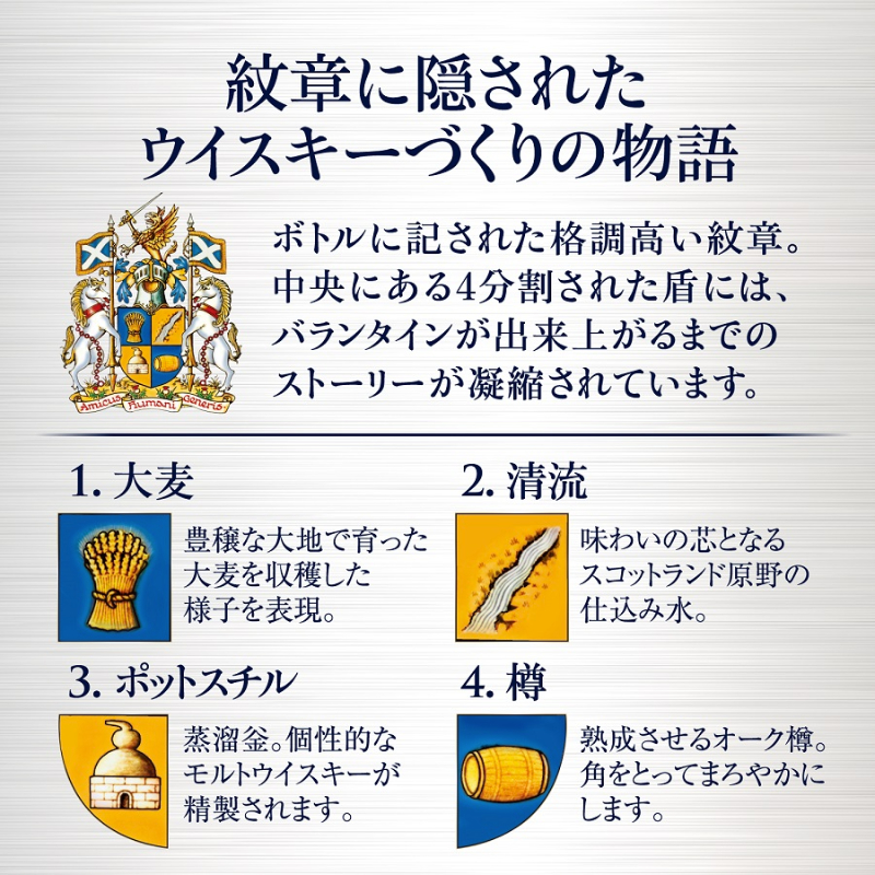 長期熟成モルト原酒と軽やかなグレーン原酒をブレンドすることで、オレンジや梨のように甘くフルーティーな香味となめらかな口当たりを実現しました。